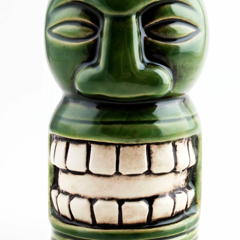 If you’re looking for a tiki mug that will have your guest admiring your collection, then you’ve found the right one. This Pineapple tiki is perfect for making all types of fruity and tropical cocktails. It is made of ceramic and has a high gloss finish. This glass has a green colored finish and features a face on the front of the glass with big white teeth. It stands 8.25″ in height with a rim diameter of 3.25″. It has a liquid capacity of 20 ounces.
