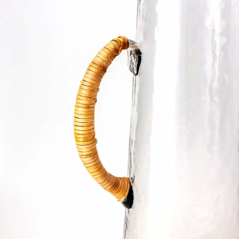 This beautiful cane wrapped pitcher is ideal for serving up refreshing beverages in a stylish way. Whether they’re hot or cold, serving lemonade, water, or even serving cocktails, This pitcher is sure to make a lasting impression on your friends and family. The cane wrapped handle allows for an easy grip and adds a protective layer to the glass handle. This pitcher stands at 11″ in height and has a rim diameter of 3.25″ This product has a liquid capacity of 68 ounces.