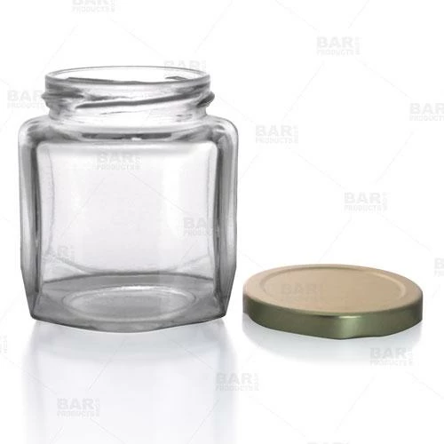 The Oval Hexagon Glass Jar w/ Lid is the perfect container for the master mixologist looking to showcase quality garnishes and ingredients. The glass jar holds up to 9 fluid ounces and is great for storing fresh fruit, herbs, spices, nuts, and any other unique ingredient. The thick glass jar is quality you can see and feel with a brass metal lid.