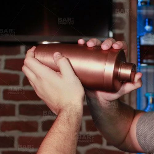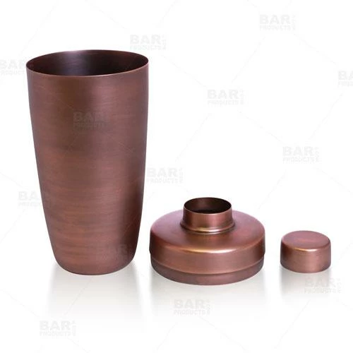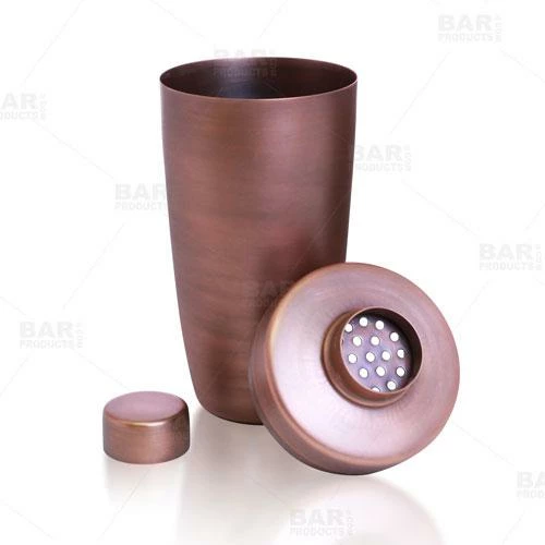 The BarConic® 3 Piece Flat Top Antique Finish Plated Shaker Set is the perfect addition for the professional or home bartender who wants to create mixed drinks with a classic “speakeasy” style. The craft cocktail movement has brought back the demand for quality barware. The copper material featuring an antique finish makes this set an exceptional piece with quality you can see and feel. The elegant set includes the shaker tin, strainer top and cap to shake and strain without leaking. The 28 oz size makes it large enough to handle volume pouring or just enough room to properly mix your favorite cocktail with ice.