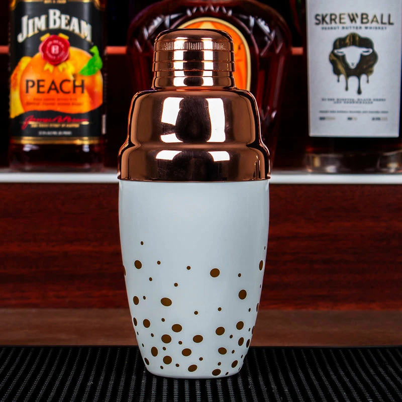 This adorable cocktail shaker is a fun and stylish tool to have in your professional or home bar. The lid is plated with rose gold thats very shiny and reflective. It is made of durable stainless steel and features a white outer layer with a gold polka dot design. This shaker has a liquid capacity of 16 ounces.