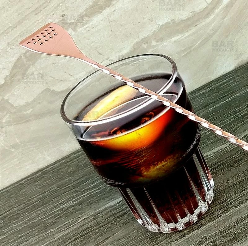 This bar spoon with strainer tip will certainly add an additional functionality to your bartending performance. The top end includes a highly functional strainer ideal for draining water or lifting ice in a build cocktail. This gorgeously reflective bar spoon showcases an exquisite Copper plating while the high quality and durable stainless steel construction backed by the BarConic® brand will ensure longevity and enjoyment. This strainer tip bar spoon is simply a delight to use with its 40cm length stem that twists down to a smooth spoon end. The design ensures a speedy stir without unnecessary stress on your fingers.