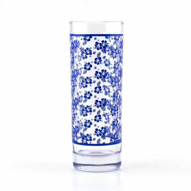 This beautiful blue hibiscus pattern highball glass will certainly enable you to serve your craft cocktails up in style. Featuring a beautiful brilliant blue (scratch resistant) imprint of a hibiscus design that wraps around the glass, this custom designed glass is definitely one that will stand out when choosing the perfectly impressive glassware to serve your libations in.