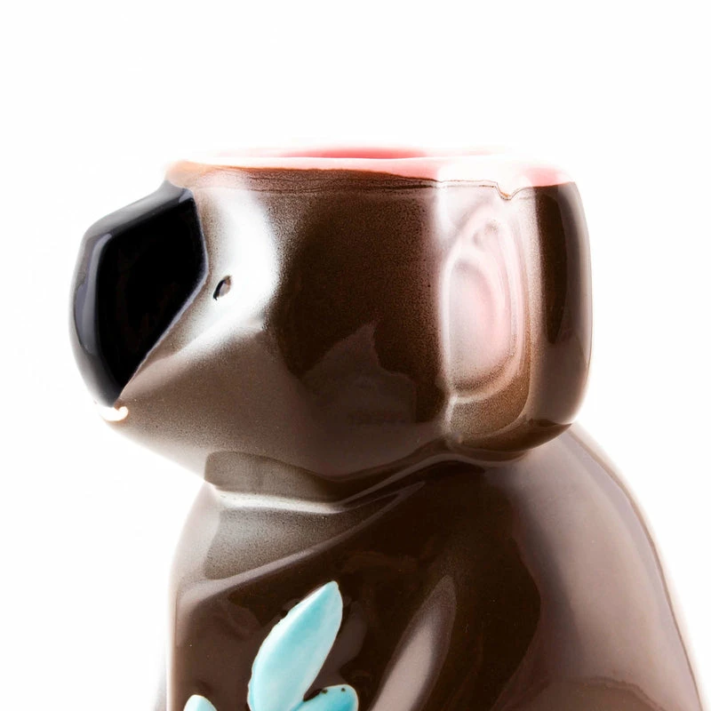 This adorable Koala tiki is just eager to find a new home in your bar. Each koala is brown and features pink colored ears and light blue highlights. It is made of durable ceramic and is hand painted and glazed to preserve its quality. It is even holding a small number of eucalypt leaves. The Kola stands 6″ tall and has a rim diameter of 2″. Has a liquid capacity of 22 ounces.