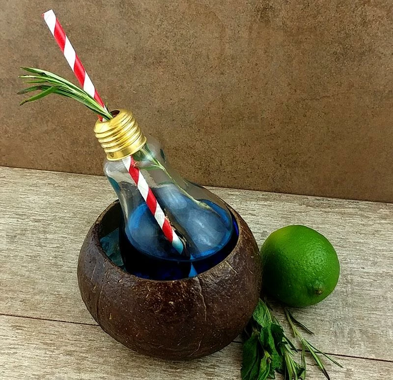 Introducing a very unique cocktail glass, in the shape of a light bulb! The beautiful rare glass design will leave your guests speechless when you serve up your next concoction. Get creative and ice down your favorite fish bowl, coconut cup or anything with a larger rim and place this cocktail glass inside of it to keep chilled. It measures 5″ tall and has a flat base bottom allowing it to stand sturdy. The top piece is metal and screws off easily, while a plastic molded cork is included as well. With this cool light bulb cocktail glass your next cocktail presentation will have sparks flying! It can also be used as a decorative piece.