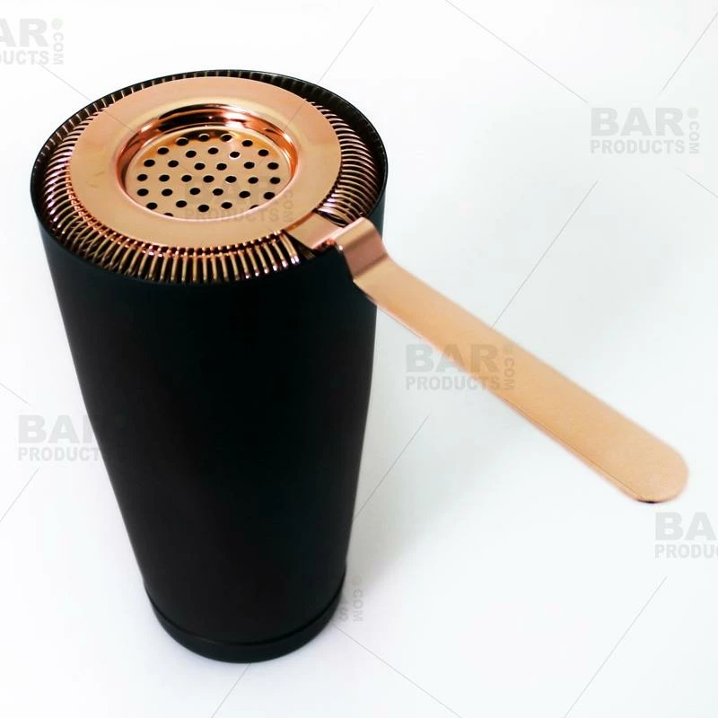 This long handled No Prong Cocktail Strainer is made to fit in any shaker. It is made of durable stainless steel with copper plating that adds an elegantly vintage look to any barware set. With this tool you will get a superior strain every time and never have a problem removing the ice from your cocktail. The tight fit of this strainer’s coils along with having no prongs allows this strainer to fit snug inside the mouth of the cocktail shaker or mixing glass. Constructed with highly-reflective copper plated stainless steel this professional grade cocktail strainer is made to last!