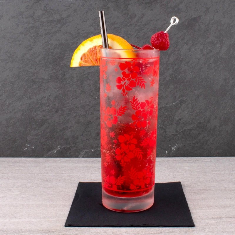 This beautiful red hibiscus pattern highball glass will certainly enable you to serve your craft cocktails up in style. Featuring a beautiful brilliant red (scratch resistant) imprint of a hibiscus design that wraps around the glass, this custom designed glass is definitely one that will stand out when choosing the perfectly impressive glassware to serve your libations in.