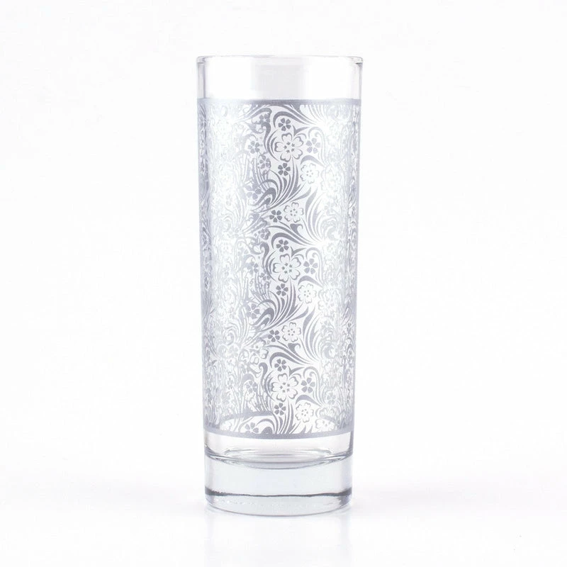 This beautiful floral pattern highball glass will certainly enable you to serve your craft cocktails up in style. Featuring a faux etch (scratch resistant) silver imprint of an elegant floral design that wraps around the glass, this custom designed glass is definitely one that will stand out when choosing the perfectly impressive glassware to serve your libations in.