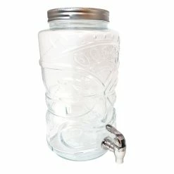 Tiki beverage dispenser holds 1.6 gallons and made with a thick, high-quality glass material. The intricate design of a tiki face blown into the glass offers smooth lines and promotes a very professional, elegant piece of glassware. Perfect for serving ice tea, lemonade, water and any other type of punch or cocktail mixture. The tap is easily maneuvered, allowing the liquid to flow smooth and splatter free with a flip of the handle. The metal lid screws on tightly into place, protecting your beverage from unwanted particles and maintaining sanitation. When you receive your product, please read the instructions on how to appropriately tighten the dispenser seal, ensuring you get the most out of your first use. Measures 12 1/2″ H x 6 1/2″ W with 4″ Rim.