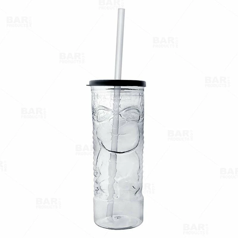Think of all the fun, fruity and tropical concoctions you can mix up in this clear tiki themed plastic cup! You are sure to appreciate the high quality plastic material and construction of this exciting novelty cup. Definitely built to last through many drink services. The black lid snaps securely into place to avoid spillage while the 12″ length clear plastic straw will ensure that your guests enjoy the entire 24 ounces of their delicious beverage. The tiki mixology trend is showing no signs of slowing down and we feel it is here to stay. Stock up on these great reusable tiki cups and enjoy one of the best movements in modern mixology.