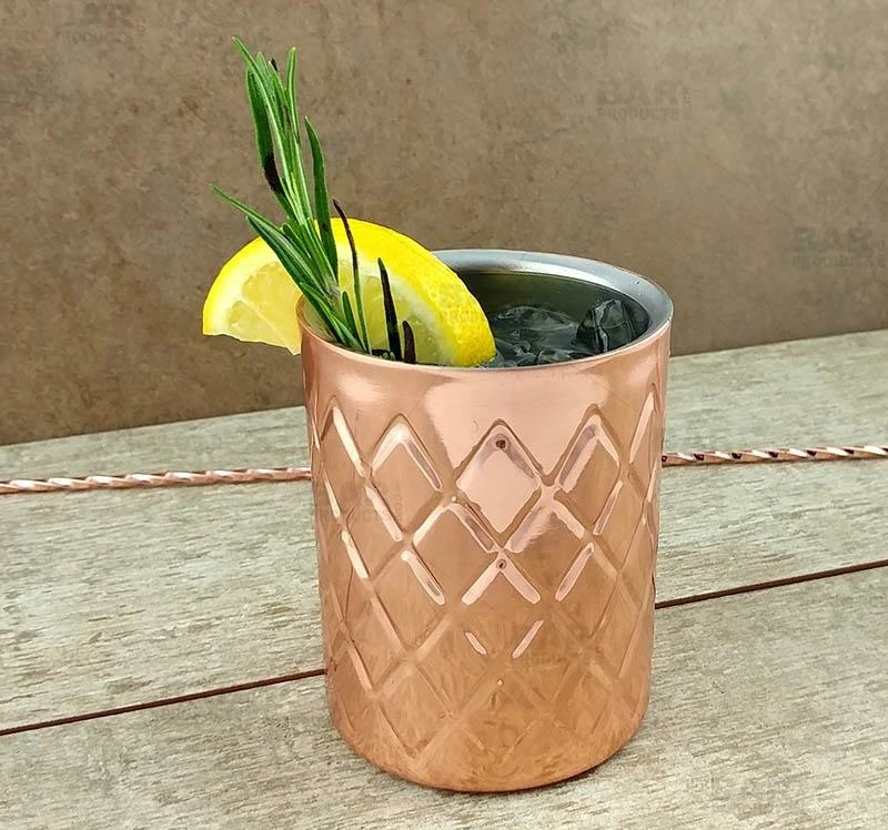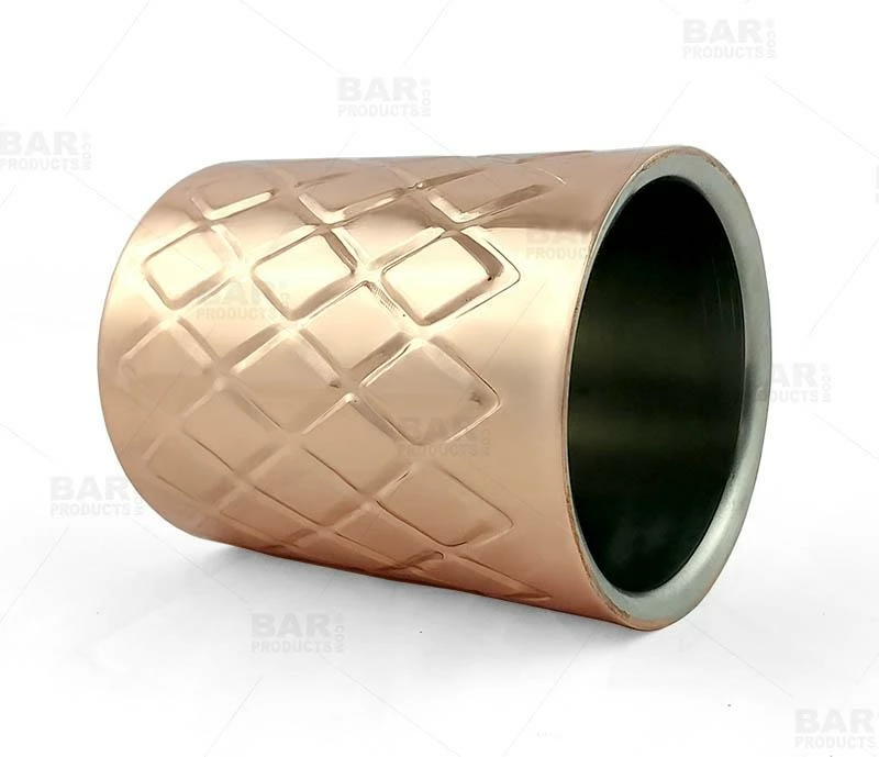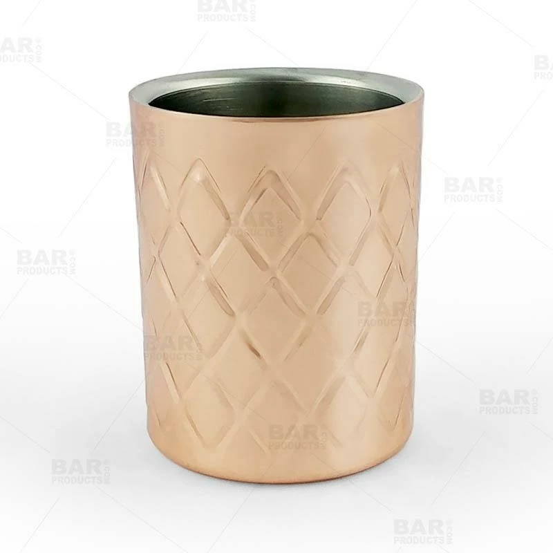 This stunningly beautiful and versatile double wall copper plated tumbler can be used for everything from cocktails and hot beverages. The durable double wall insulated design keeps your drink at the perfect temperature for longer periods of time, versus other standard drinkware. This BarConic® 10 ounce tumbler has a stunning copper finish and features an embossed diamond cut pattern. Add a stylishly vintage look to your drinkware collection today. Measures 4″ tall x 3″ in diameter.