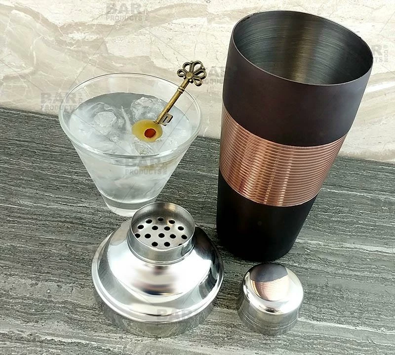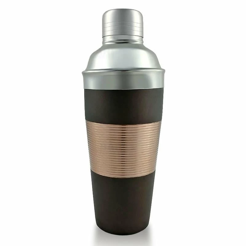 We love taking the standard 3 piece cocktail shaker to a stylish new level. This gorgeous 28 ounce shaker has a rustic appeal by combining several color elements. A reflective ribbed copper center interrupts a subtle matte espresso body and is then topped off with a reflective stainless steel top accent.