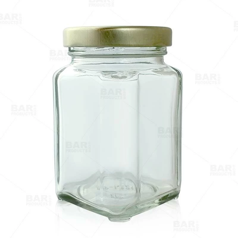 - Gold lid fastens air tight to jar, ensuring longevity and freshness