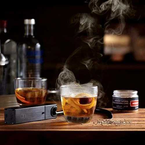 With this Portable Infusion Smoker you are minutes away from eating delicious smoked food just grab it, light the wood chips, teas and spices, even hay, dried flowers and herbs to infuse a variety of natural smoky flavors to an array of food and drinks, cheese and cocktails This ingenious mini smoker is an alternative to traditional smoking methods. When you use our flavor filled wood chips, you get unique distinct flavors that are subtly released. With this cool smoker you will be able to effortlessly infuse your drinks with a natural smoky flavor. This new way of smoking is gentle enough for fruits, veggies, simple syrups, salts, ice and other garnishes, imparting a delicate flavor without changing the texture or temperature. Since all of the heat is contained in the smoking chamber, the smoke that is released is cool and gentle. A great way to infuse the spirit itself before using it as a component ingredient in a finished cocktail is by way of a sealed decanter. The smoky aromas emitted from this flavor infuser are perfect with bourbon, Bloody Maryโs and Manhattans. Customers or guests will love watching the swirling smoke and savoring the amazing results from this sleek portable infusion smoker. Add style and complexity to your favorite cocktails using authentic different wood smoking chips. Measures 1.5” H x 1.5” W x 9” D