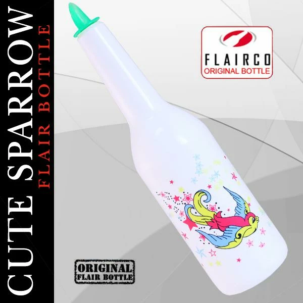 The Cute Sparrow Design is sure to be a favorite of lady bartenders everywhere. This cute design is printed on the world’s best practice bottle- the FlairCo™ Flair Bottle. FlairCo™ Bottles have been trusted by the professionals for years, and are designed to thoroughly mimic the weight and feel of an actual bottle. The high endurance, one piece plastic injection mold allows for years of practice and growth of your flair skills. They are built to last through the wear and tear of missed catches, and are the perfect flair bottles for any flair bartender!