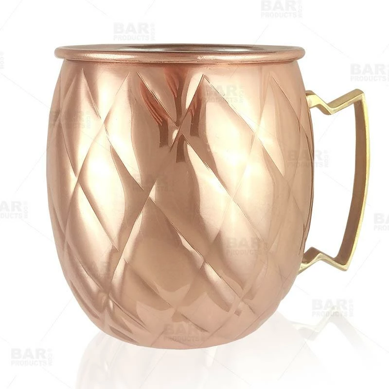 This gorgeous copper plated Moscow Mule Mug brings an authentic element to a traditional item. Designed by skilled artisans, this reflective diamond pattern mug design is very desirable while showcasing an ergonomic handle. The stainless steel interior walls of this mug offers its consumer a refreshingly and ultimately chilled cocktail for longer by igniting the ice within.