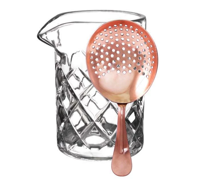 This BarConicยฎ cocktail tool set combines a medium-sized Diamond Pattern Mixing Glass and a Copper Plated Julep Strainer that fits perfectly atop it.