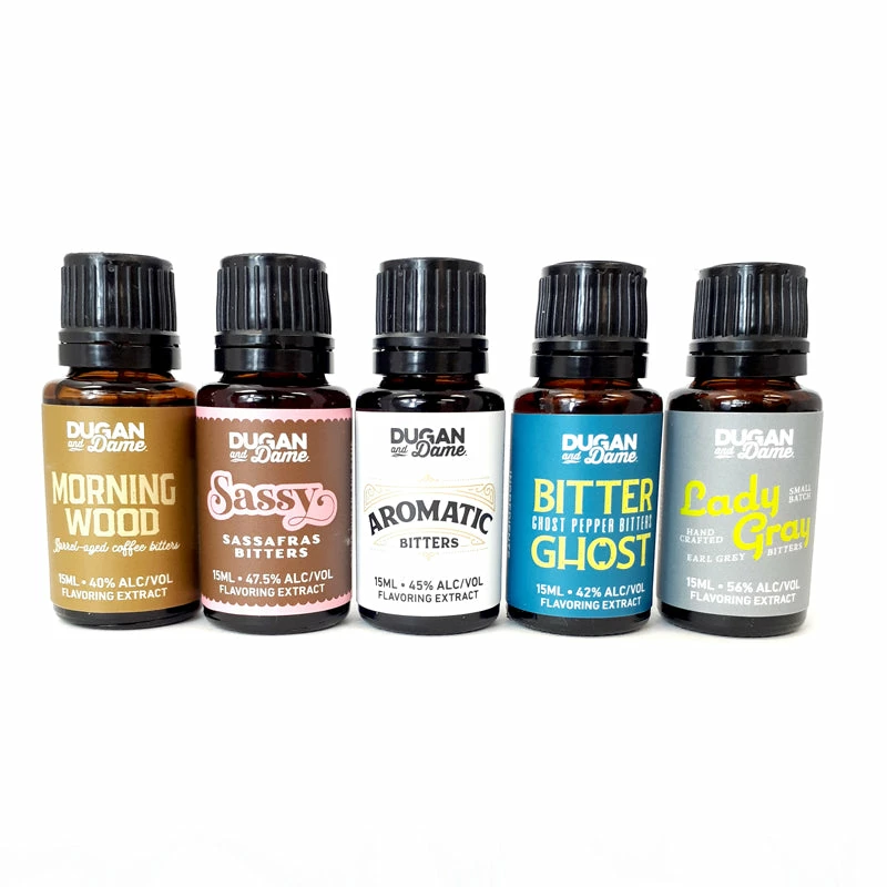 Dugan and Dame Cocktail Bitters Bar Mini Pack holds five 15 ml glass bottles. Hand-crafted with only organic and wildcrafted botanicals. The bold flavors allows you to add variety to your concoctions and is perfect for traveling. This pack is also great for gifting and comes with a QR code that links to all of the Dugan and Dame online recipes.