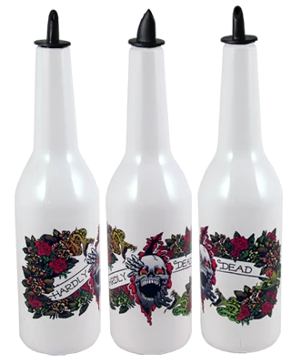 Flair “vintage style” with our new rockin Hardly Deadโข design bottles. These are a must have for those who want to flair with the hottest new styles. Let all the skeletons out of the closet with this flair bottle, and when you’re done with it put it back on a shelf for all to see. These flair bottles are so full of kick butt vintage art that you can use them to replace that lame lava lamp, or add a new twist to your bar.