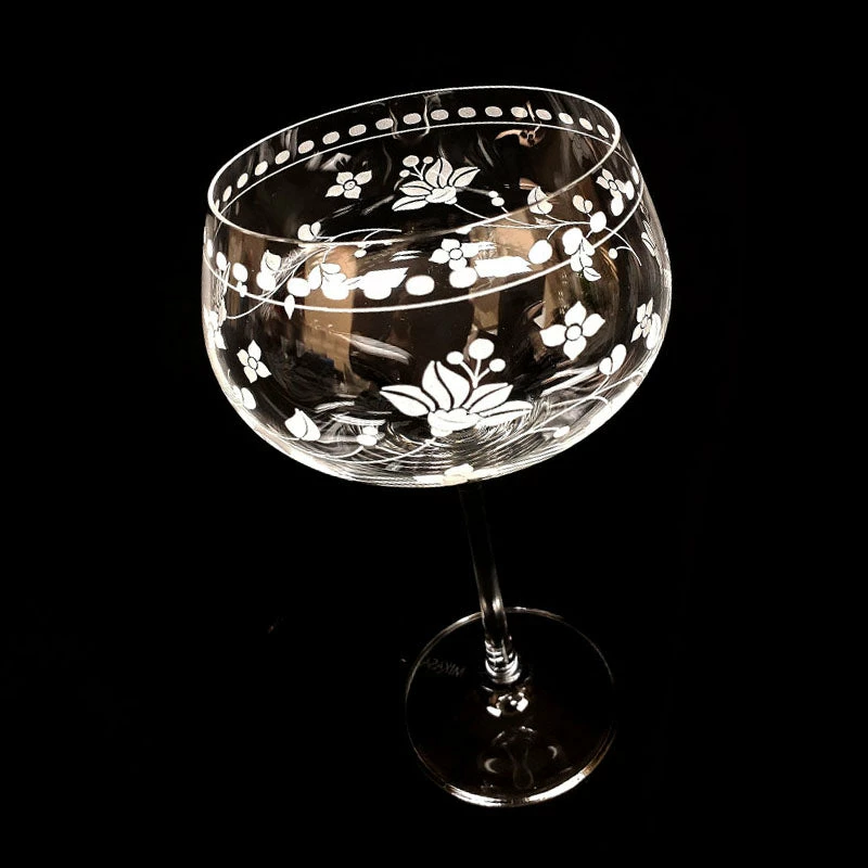 Set of 4 classic style vintage floral coupe glasses. Beautiful etching suavely woven around the glass, livening the allure of the cocktail inside. Enjoy your favorite wines, spirits and other beverages at any time. This set is ideal for pairing with casual or formal events. Made of lead-free crystal. Holds 13.5 ounces and measures 8″ H x 3 3/8″ W. Dishwasher Safe.