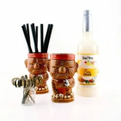 The Head Hunter themed Tiki set is a great addition to any home bar or tiki lover. These ceramic tiki mugs are strong and durable and are sculpted with intricate detail all around. This kit comes with durable reusable plastic straws that are a great for almost any beverage and comes with black round bamboo picks to garnish your drink with your favorite fruits and berries. To top it off, this kit also comes with a bottle of Jordan’s Skinny Pina Colada mix so you can enjoy all the flavors of your favorite tropical cocktail.