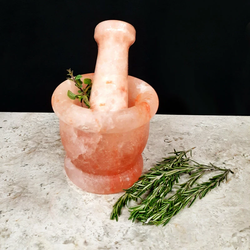 Hand-carved Himalayan Salt mortar and pestle. Used since ancient times to prepare ingredients by crushing and grinding, which releases flavors and fragrance for you to enjoy. Properties of the salt mortar and pestle helps to extract them from the cells of the plant. Mortar measures 4 โ โ Height x 4โ Base x 3 ยฝโ Rim. Pestle measures 5 ยผโ long.