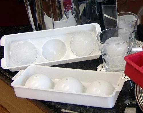 Now you can make your own ice balls in the comfort of your home (or restaurant!). Spheres of ice are preferred because the smaller surface area means the ice melts slower, keeping drinks cold without becoming too diluted. Keep a large bowl in your freezer and make several ahead of time. You can also freeze herbs, flowers, candies, etc. inside. Or freeze juices and use the balls to keep a punch bowl cold. It’s unlimited to your imagination!
