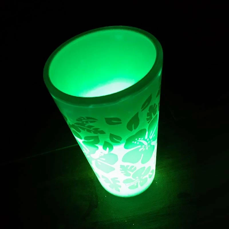 Glow Cup with a hibiscus flower design. Fun for all ages and great for island parties. Crack the green glow ampules by squeezing the bottom sides of the cup. This cup will glow 1 time only. Measures 5 ½” Tall x 2 ¼” Base x 2 ¾” Rim.