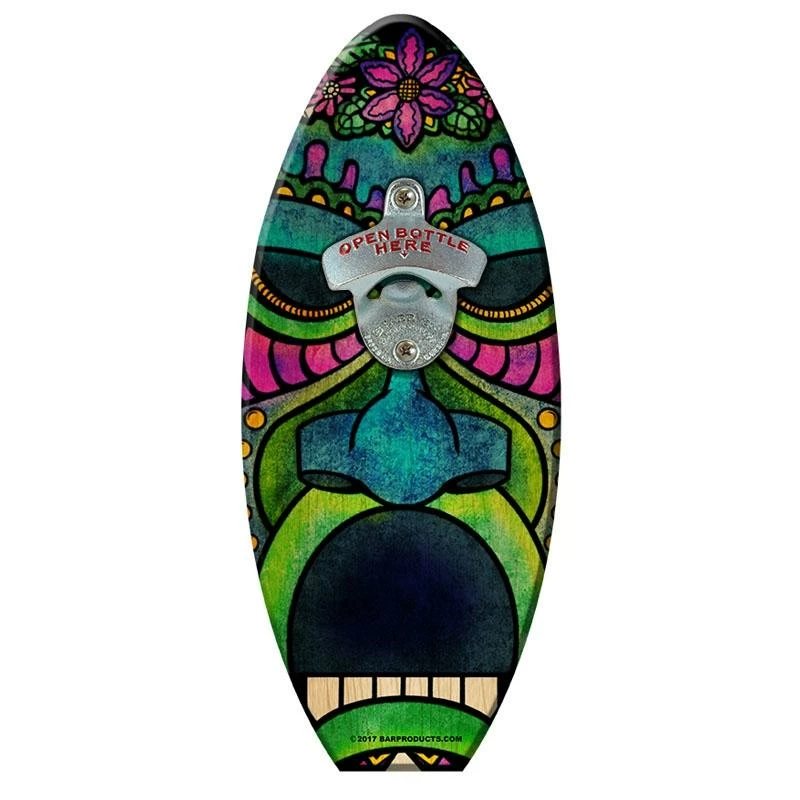 Wall mounted bottle openers don’t only add an awesome utility, but also offer a desirable decor element. Much like this Surfboard shaped Tiki Man design. The full color imprint combined with the rustic look of the wood grains makes for the perfect addition to your home bar, kitchen or outdoor patio! The cast iron opener is securely fastened to the handcrafted plaque. Guests will love the fun vibe as well as convenience of this bottle opener.