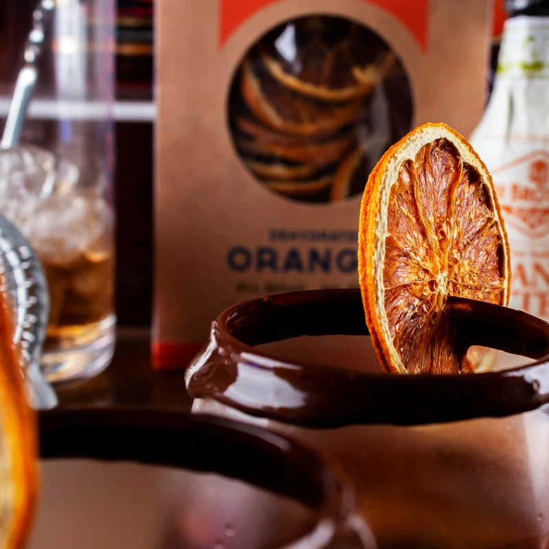 Strain into a chocolate rimmed rocks glass with one large rock. Garnish with a chocolate dipped orange peel.