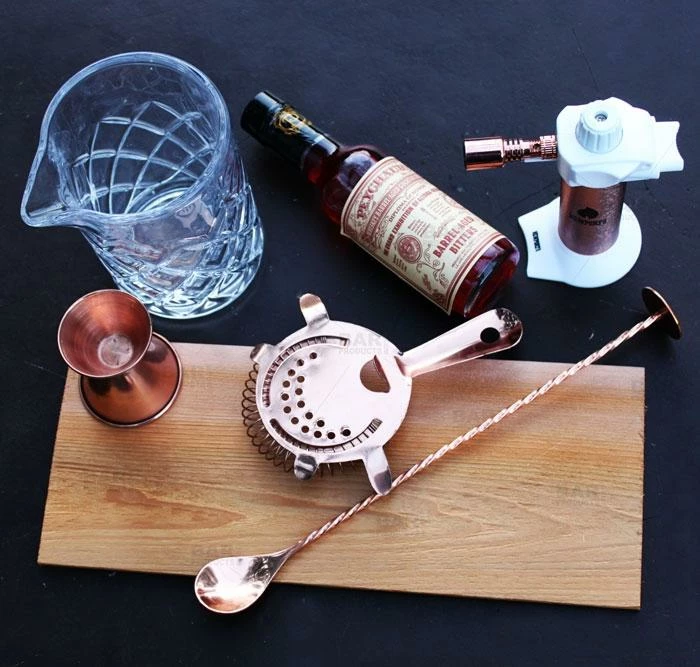 Create the ultimate Smoked Cocktail with this high quality old fashioned cocktail kit! It has everything you need to mix your cocktail in style. The Diamond Pattern mixing glass is the perfect size to create this flavorful cocktail in. We have also included a copper measuring jigger and bar spoon, so you’ll always have the right portions. Use the torch to burn the cedar plank and then put out the flame with the glass you plan on serving your cocktail in. The wonderful smell of the burnt cedar board will fill and flavor the glass. We love the Ice Block Rocks Glass or the Diamond Cut Rocks Glass (Glasses sold separately).