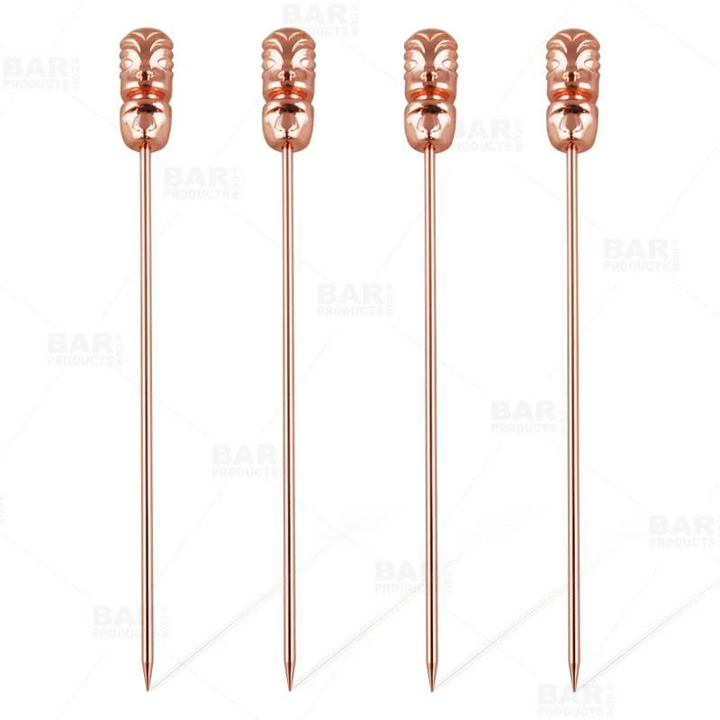 Add a touch of the pacific islands along with a classy copper element to your next cocktail party. These high quality copper plated tiki-inspired cocktail picks will do just that! They are gorgeously polished with desirably detailed reflections, taking the ordinary to extraordinary. Garnish any type of cocktail with these gorgeous metal cocktail picks and impress your guests all night long. Sold in packs of 4, these cocktail picks are stainless steel with a beautiful copper plating.